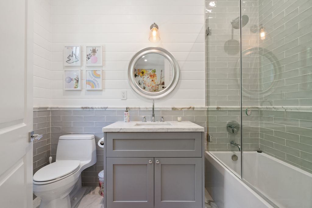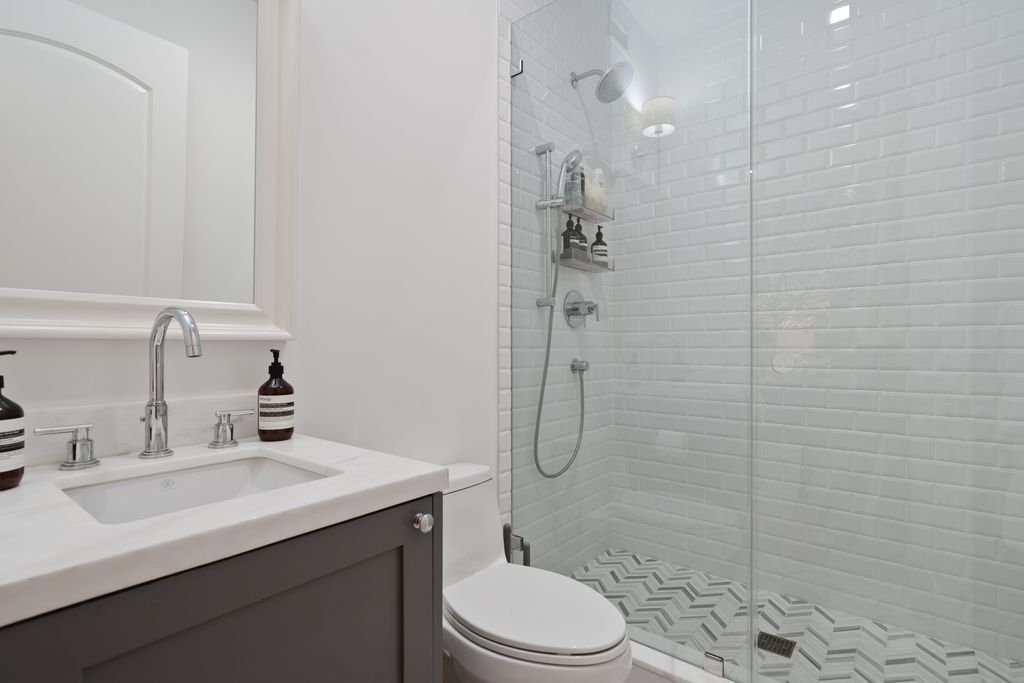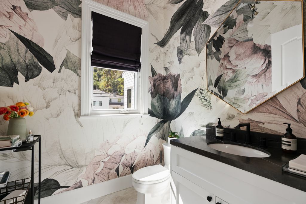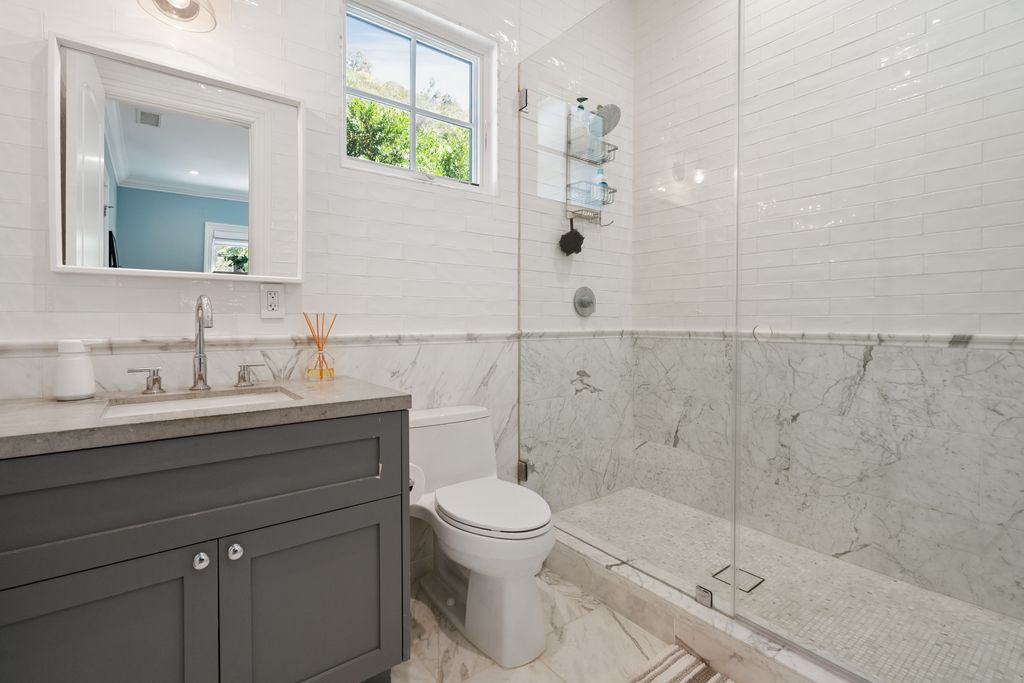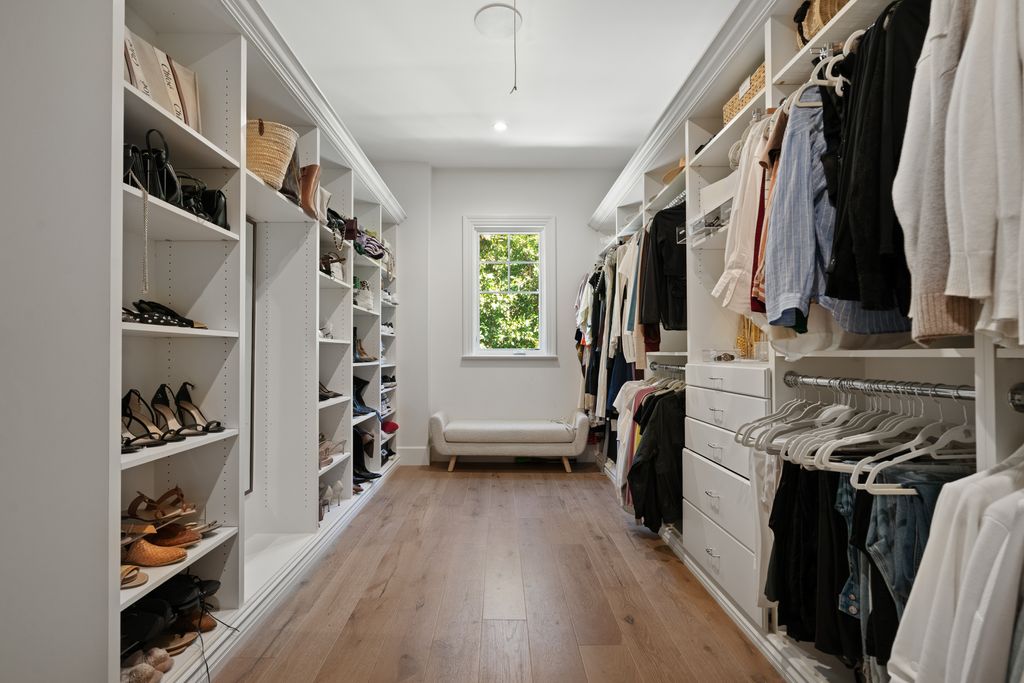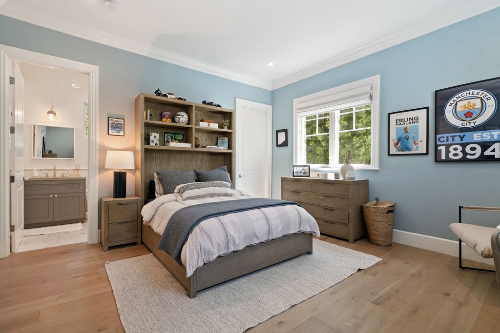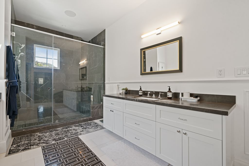 The primary suite is a retreat unto itself with soaring 15-foot ceilings and dual spa like baths, outfitted with stylish Grohe fixtures. Upstairs, you’ll find three additional bedrooms, each with its own ensuite bath, offering privacy and comfort. A fifth bedroom guest suite is tucked away on the first floor, providing a quiet and private space for visitors.